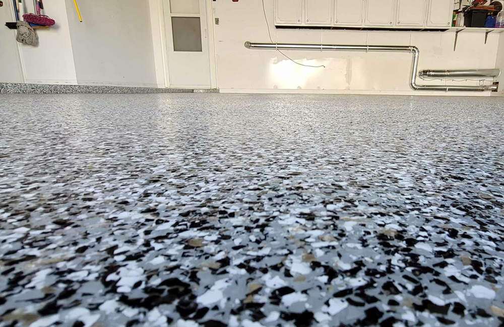 Flake systems aren’t a coating type on their own. They’re a decorative layer added between the base and topcoat. But they’re worth mentioning because the flakes add texture, which improves slip resistance on wet floors. They also hide dirt, tire marks, and minor imperfections better than solid-colour floors.